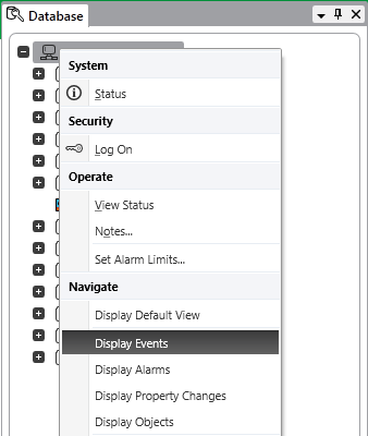 You can display a list of events that have occurred on a single Geo SCADA Expert system (database). The List is pre-filtered by time—the period for which events are initially shown is defined by your User Account (or the Guest User Account if you are not logged on to Geo SCADA Expert).