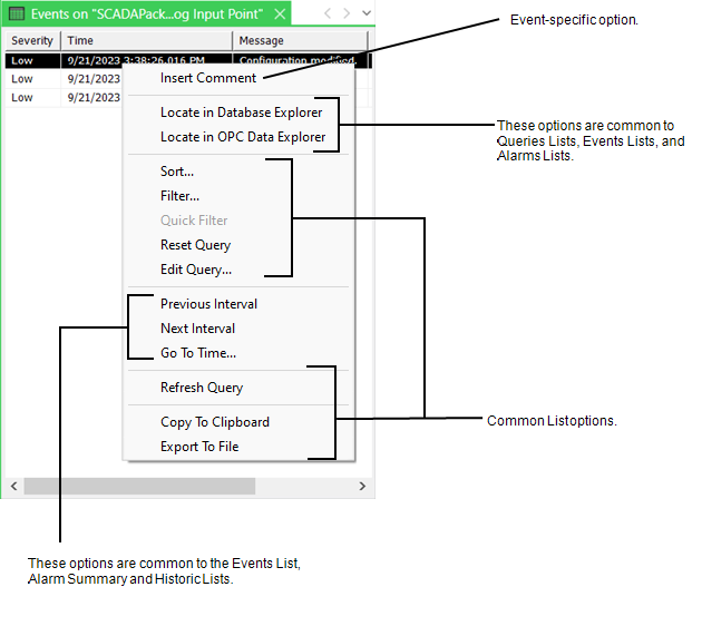The context-sensitive menu options on Historic Lists and Alarm Summary are similar to those on Events Lists (see Work with Common List Options).