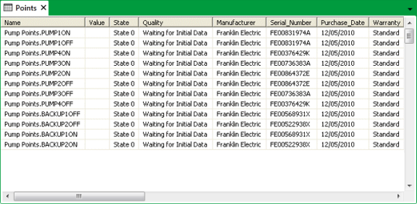 In Geo SCADA Expert, each pump is represented by two database points (one to power the pump on, and one to power it off). The various values of the points can be viewed on the Points List which works by querying the CDBPoint table in the Geo SCADA Expert database.