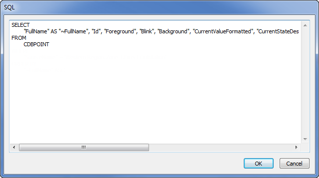 You can also use embedded Lists on Mimics to query Third Party ODBC database tables. As long as Geo SCADA Expert has a link to the table that is to be queried, the SQL of the embedded List can be configured to query a Third Party ODBC table. This works in the same way as querying a Geo SCADA Expert database table (see Editing an Embedded Query Listin the Geo SCADA Expert Guide to Mimics).