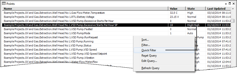 Geo SCADA Expert includes a Quick Filter feature that allows you to filter various types of List, including an Events List, Queries List, or a Historic List, with a single command. You can use the Quick Filter feature to filter a List according to any of the values shown on the List. For example, if you are viewing a Points List, you can use the Quick Filter feature to filter the Points List so that it only shows those points that have Good quality data.