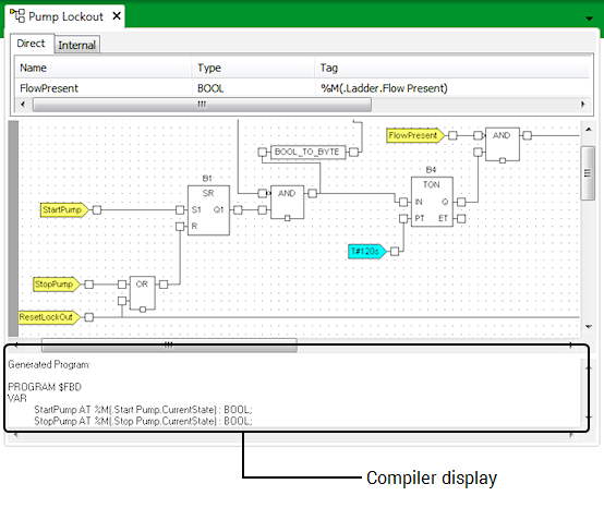 The Function Block Diagram is compiled and the compile messages are shown in the Compiler display.
