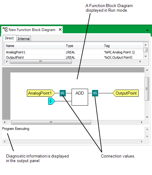 When you display a Logic program in Run mode, you can view its operational status on the Geo SCADA Expert Server.