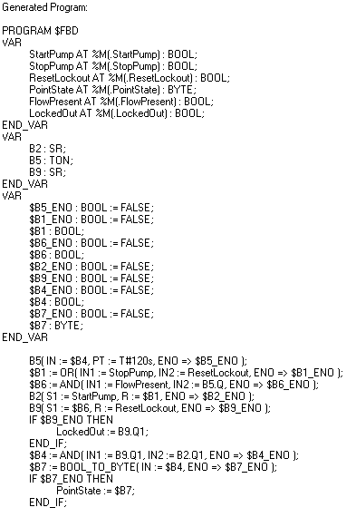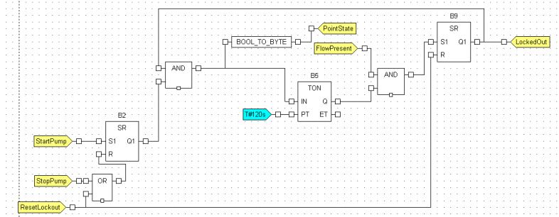 The following function block diagram is an example of a Logic program that could be used as a safety interlock for controlling a pump. It is used to control a pump - the pump cannot be started when there is no flow. This is achieved by establishing these relationships: