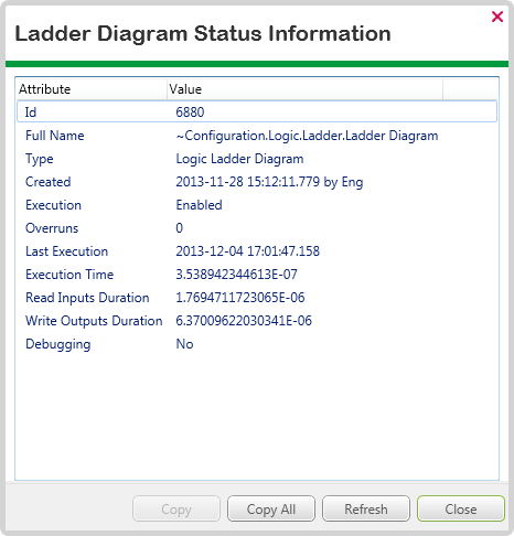 The Status Display provides status information about the Logic program, including attributes that are common to many types of database item such as Id and Full Name, as well as the following Logic-specific status attributes: