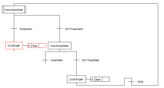 Sequential Function Chart (SFC) programming resembles computer programming flowcharts. An initial step “action box” (the starting point of a flowchart) is followed by a series of transitions and additional action steps.
