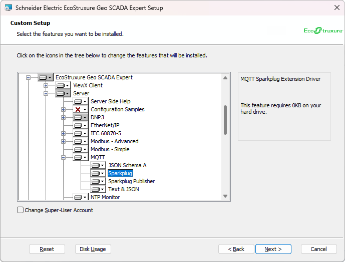 The Sparkplug component is located in the Server group, in a branch off from its MQTT ‘parent’ driver component. To check that this component has been installed, ensure that the symbol to the left of the text Sparkplug does not have an X on it.