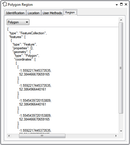 To create polygon regions you need to be familiar with the GeoJSON format for encoding geographic data structures. For more information about GeoJSON refer to the GeoJSON Specification, also the website geojson.io can be used as an aid in creating polygons.