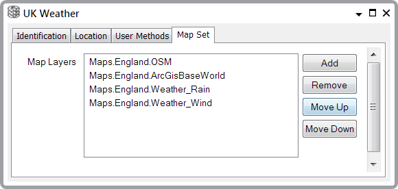 The Map Layers field also has four buttons, Add, Remove, Move Up and Move Down, which enable you to manage the Map Sources in the Map Set.