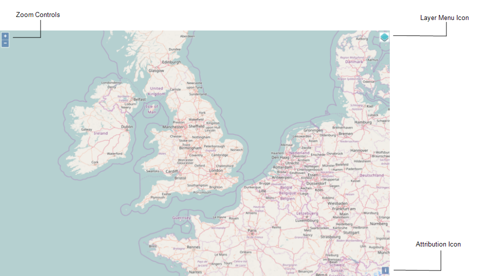 A Geo SCADA Expert map has zoom controls and may have an Attribution Icon (if there is attribution information for the map's base layer). Multi-layer maps will also have a Layer menu. These items are described in detail below.