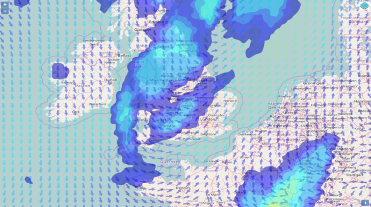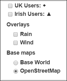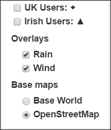 For example, if you select the OpenStreetMap base layer and the overlay options, Wind and Rain: