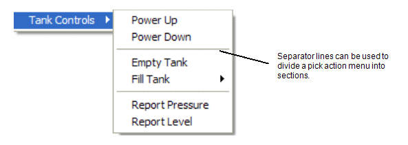 You can use the Add Separator feature of the Pick Menu window to add a separator line to your custom pick action menu. By using separators, you can divide your custom pick action menus into sections, for example: