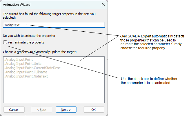 3. Use the Yes, animate the property check box to define whether the property is to be associated with a value in the database. Select the check box if the property is to be animated otherwise leave it clear.