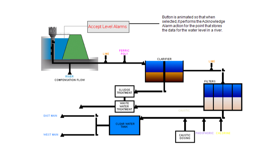 You can animate a Mimic object so that when it is selected in Run Mode, a specific action is performed rather than a pick action menu being displayed. For example, you could configure a shape to represent a button and animate it so that when selected, it acknowledges an alarm for a specific point.