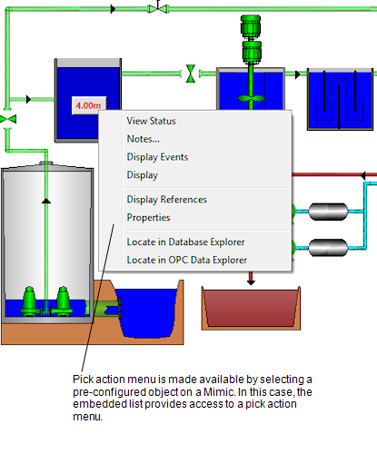 Typically, Mimics are designed to allow operators to perform their duties via the Mimic displays. The Mimics often contain objects that are associated with pick action menus—when you select these objects, a menu is displayed. The menu contains the options that allow you to interact with the system, such as Override and the various alarm controls
