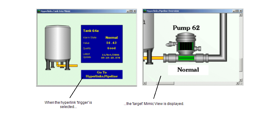 The hyperlink will be available when the Mimic is displayed in Run Mode. When the 'trigger' object is selected, the 'target' Mimic View will be shown in the relevant window (defined by the type of hyperlink).