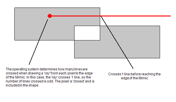 The areas that do not overlap are included in the shape. The operating system determines this in the same way, by counting the number of lines crossed when drawing a 'ray' from each pixel to the edge of the Mimic. As the number is odd, the pixels are included in the shape.