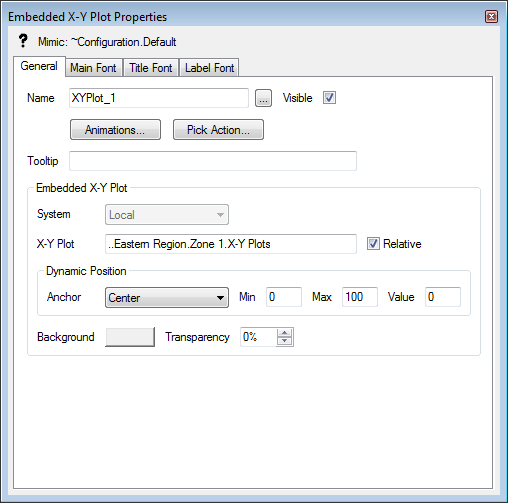 When you have added an embedded X-Y Plot to a Mimic, you can access its Embedded X-Y Plot Properties window to edit its settings. To display the window, double-click on the object on the Mimic. (For other ways of displaying the window, see Display the Properties Window for an Object on a Mimic.)