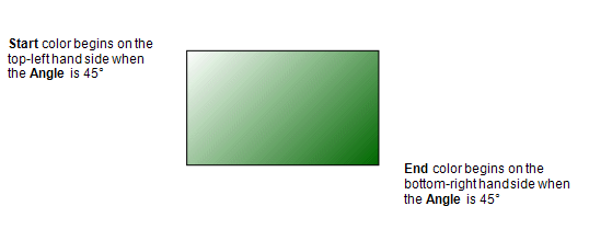 • Angle—The Angle spin-box is only available when you select the Linear Gradient style of shading. You can use it to alter the position of the Start and End colors. For example, if you set the Angle to 45°, the Start color begins at the top left-hand side of the object and the End color is at the bottom-right hand corner of the object.