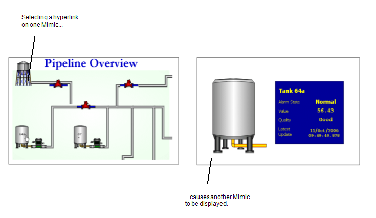 Hyperlinks are special parts of a display that, when selected, cause another display to be shown. For example, a shape on a Mimic can be configured to act as a hyperlink to another Mimic. The Mimic that is to be displayed when the hyperlink is selected is referred to as the 'target'. When the shape is selected, the 'target' Mimic is displayed (either in place of the Mimic, or in a new window depending on the configuration of the hyperlink).