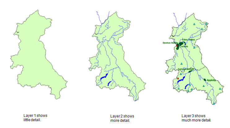 You can set each layer to be visible or hidden when the Mimic is displayed at a specified level of magnification (or within a specified range of magnification). For example, an overview Mimic could show the basic overview of a site at the default level of magnification, but layers containing additional information about specific plant could be made visible when a user 'Zooms In' on the Mimic.
