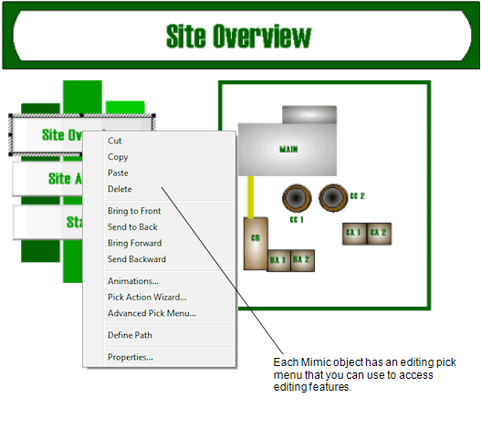Each Mimic object also has an editing pick menu. You can access the editing pick menu by right-clicking on the required object (in Design mode).