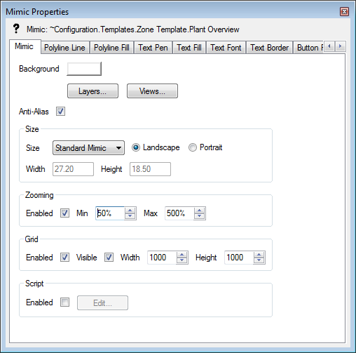 Each Mimic has a Mimic Properties window that you can use to define the default settings for: