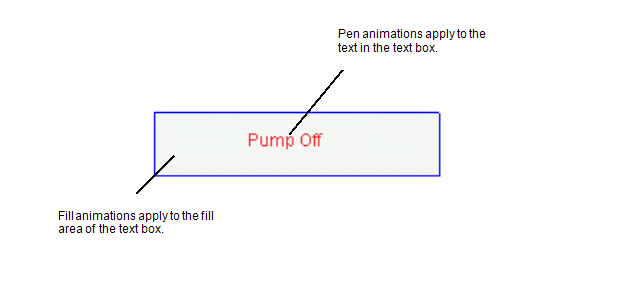 The Pen properties are identical to the Fill properties except that they apply to the text in a text box rather than the fill (see Fill Animations). For example, the FillColour property for the Pen group defines the color of the text whereas the FillColour for the Fill group defines the color of the area of a shape or text box.