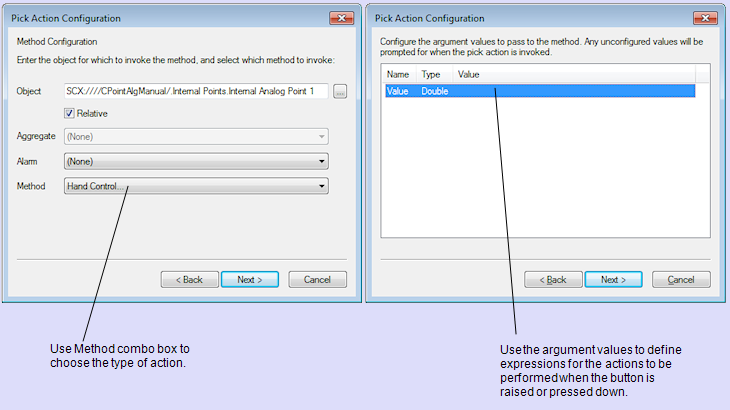After selecting Method as the type of pick action, you can use the next two 'pages' of the Wizard to setup the action that is performed and the value that is set when the button is up (raised) or down (pressed down).