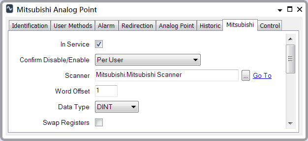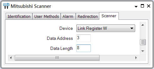 A scanner scans several Link Registers on a Mitsubishi PLC. Within Geo SCADA Expert, the Scanner has this configuration (the PLC type is set to ACPU):
