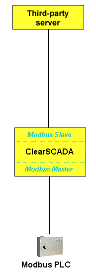 Where a third-party server uses the Modbus protocol to obtain data from Geo SCADA Expert, and Geo SCADA Expert uses the Modbus protocol to obtain its data from a PLC, Geo SCADA Expert becomes dual-purpose, with regard to Modbus functionality. When communicating with the third-party server, Geo SCADA Expert acts as a Modbus Slave, and when communicating with the PLC, Geo SCADA Expert acts as a Modbus Master.