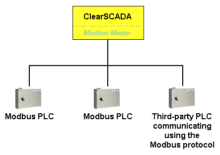 Where Geo SCADA Expert retrieves data from Modbus PLCs, or third-party devices that are communicating using the Modbus protocol, the Geo SCADA Expert system acts as a Modbus Master.