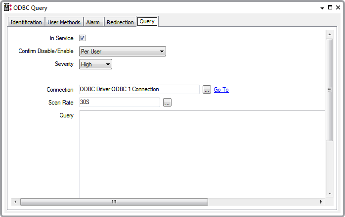 - In Service—Use to specify whether the ODBC Query is active or inactive (see Placing an Item In Service in the Geo SCADA Expert Guide to Core Configuration).