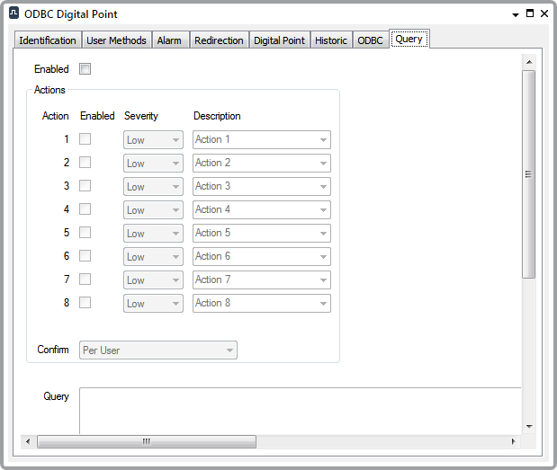 Select the Enabled check box if the point is to be used to update or insert values in another database. Use the Actions section of the tab to define the properties of the control. The fields within this section are typically displayed on the Control tab for digital points on other drivers—for further information, see Define the Output Actions in the Geo SCADA Expert Guide to Core Point Configuration.