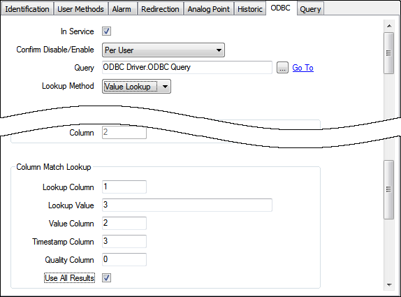 As the Use All Results check box is selected, this results in the ODBC Analog Point being given the values of 10.2, 11.4, and then 11.3 respectively. (These are the values retrieved, in ascending timestamp order, from the entries in Lookup Column 1 (‘ValueId’) that have a Lookup Value of 3. The point values are retrieved from column 2 (as Value Column = 2) and the timestamps from column 3 (as Timestamp Column = 3).)