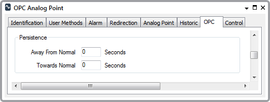 On the OPC tab, you can use Persistence properties to prevent a change in value from affecting the point state until the point has been in that state for a specified time. This prevents the server from processing momentary changes of state and reporting those changes (see the example, below).