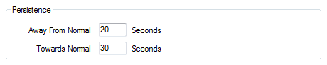 Use these fields within the Persistence section of the tab to define any persistence properties. In each instance, the persistence time begins whenever the point value drops below or rises above a state limit (by default, High-High, Low, and so on).