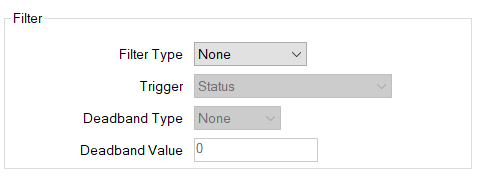 - Filter Type—Use the combo box to specify the type of filter that is to be applied at the OPC UA Server for notifications on this point. Choose from: