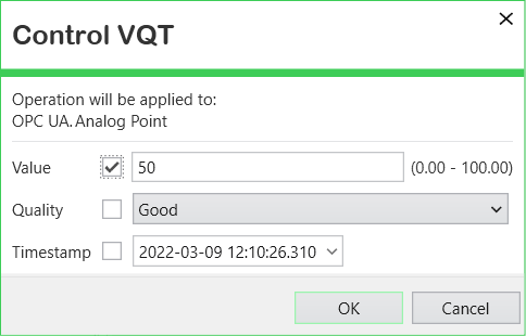 - Timestamp—Select the timestamp to write to the item. The time and date at which the Control VQT window was opened is shown by default, however you can specify a different timestamp if required.