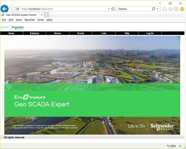 A Default View, such as a custom Mimic, is displayed instead of the above image, if the Root Group on your system is assigned a Default View. Such a ‘file object’ might, for example, comprise an overview of your system. For more information, see Defining a Default View in the Geo SCADA Expert Guide to Core Configuration.