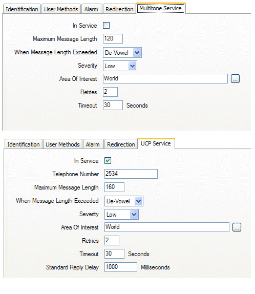 The Pager Service configuration Form contains several tabs. The Identification, User Methods, Alarm, and Redirection tabs are common to many types of database item (see Tabs on Configuration Forms). The <Pager> Service tab is specific to Pager Services and varies according to the type of Pager Service. For example, the Form for a TAP Pager Service has a TAP Service tab.