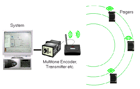 With Multitone systems, Geo SCADA Expert communicates with a Multitone pager by using the pager driver to send a message to the Multitone devices (encoder, transmitter, and so on). This message is then broadcast to the relevant Multitone pager device. However, the Multitone pager device can only receive the message if it is within the signal range of the transmitter.