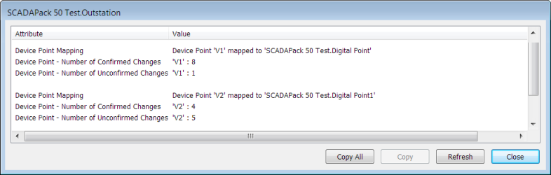 For outstations, the Status display shows this information for each device point that is mapped to a Geo SCADA Expert point. There is one Device Point Mapping attribute line for every mapped point, as shown in the illustration below: