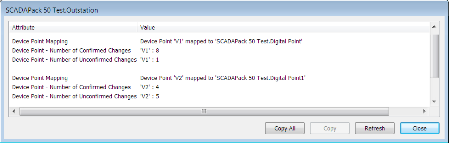 For points, this status attribute shows the number of proposed configuration changes to the device point, for which Geo SCADA Expert has received a confirmation message. If the Geo SCADA Expert point is mapped to a point on the device, the attribute also shows the device point name (V1-V8), as shown in the illustration below: