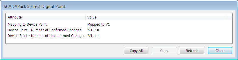 For Geo SCADA Expert points, this status attribute shows the number of unconfirmed configuration changes to the device point. If the Geo SCADA Expert point is mapped to a device point, then the attribute also shows the name of the device point to which the Geo SCADA Expert point is mapped (V1-V8), as shown in the illustration below:
