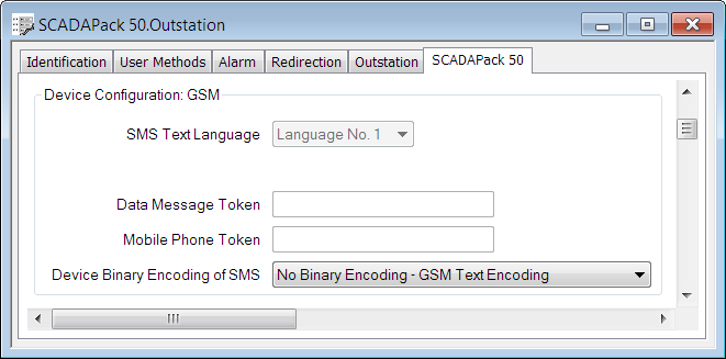 Use the fields within the Device Configuration:GSM section on the SCADAPack 50 tab to configure the properties associated with the SMS messages sent by a device.