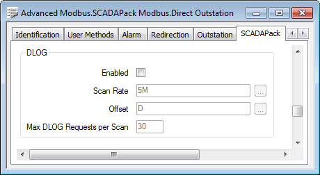 Use the fields within the DLOG section of the SCADAPack tab to define whether Geo SCADA Expert is to scan logged data (DLOG) records on a SCADAPack controller, and the settings for such scanning: