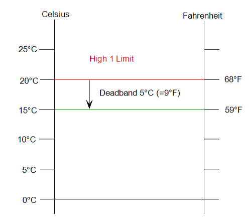 The above image shows a High Alarm Limit (at 20° Celsius, which equates to 68° Fahrenheit) in red and an Alert Clear Value Deadband of 5° Celsius (9° Fahrenheit). The Alert Clear Value Deadband is subtracted from the High Limit to give the level at which the alert will clear (15° Celsius, 59° Fahrenheit) in green.