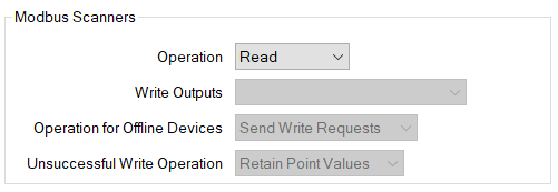 When the Operation field is set to Read, the rest of the fields in the Modbus Scanners section are disabled.