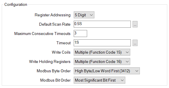 The Configuration section of the Modbus tab allows you to specify the settings that enable the SCADAPack x70 to scan the Modbus Server device.